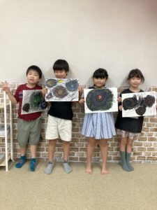 画用紙いっぱいに大きい花火を1個描いた生徒さんもいれば、中くらいや小さい花火を何個かバランスよく描いた生徒さんもいました。