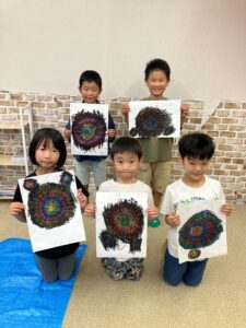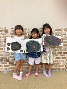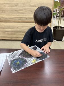 花火=Fireworks、引っ掻く=Scratch、黒で塗る=Paint/Color with a black crayon、竹串=a bamboo stickなど、簡単な英単語やフレーズにも触れ、Scratch Artの手順を英語で説明することにも挑戦しました。みんな、とても上手にできていましたよ!
